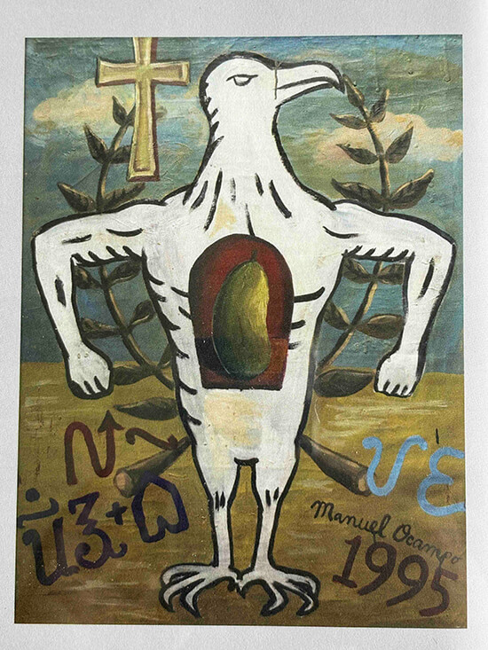 We stop at Nunelucio Alvarado’s “Maid in Negros Goes Global,” an intense work depicting rich men gravitating towards an innocent girl with covetous looks. Silvana says it speaks to her of “the poverty, and the way the rich grab what they can get from the poor.” Not surprisingly, it sits next to an untitled outburst from Manuel Ocampo, who’s “very much involved in history, very much against materialism, the Church.” The Bald Eagle flexing its muscles represents “the strength of America.”