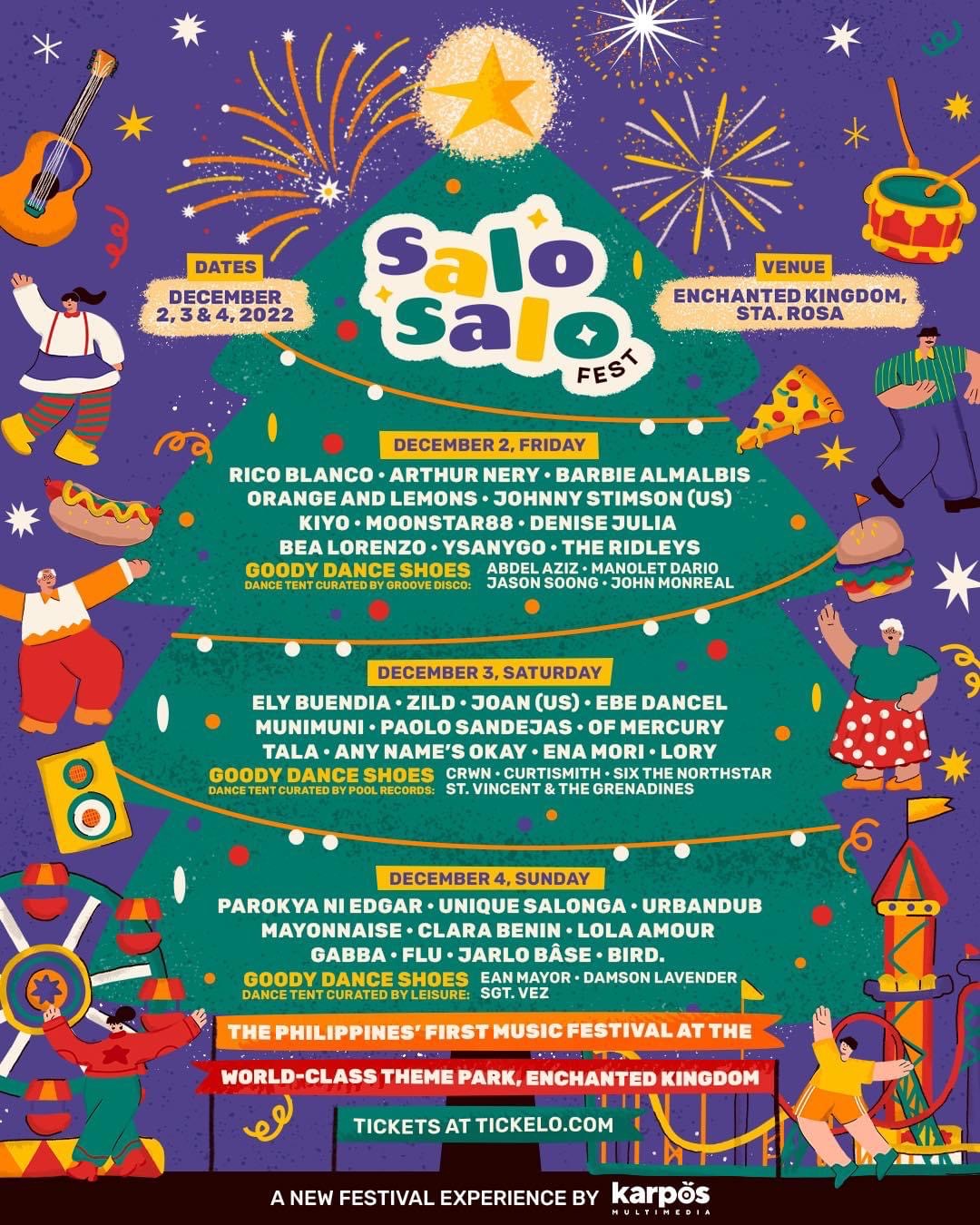 Announced by event organizer Karpos Multimedia on Sept. 13, Salo-Salo Fest will be held on Dec. 2 to 4 at Enchanted Kingdom in Sta. Rosa, Laguna. It is dubbed the first-ever theme park music festival in the country, having the popular leisure destination as its official venue.