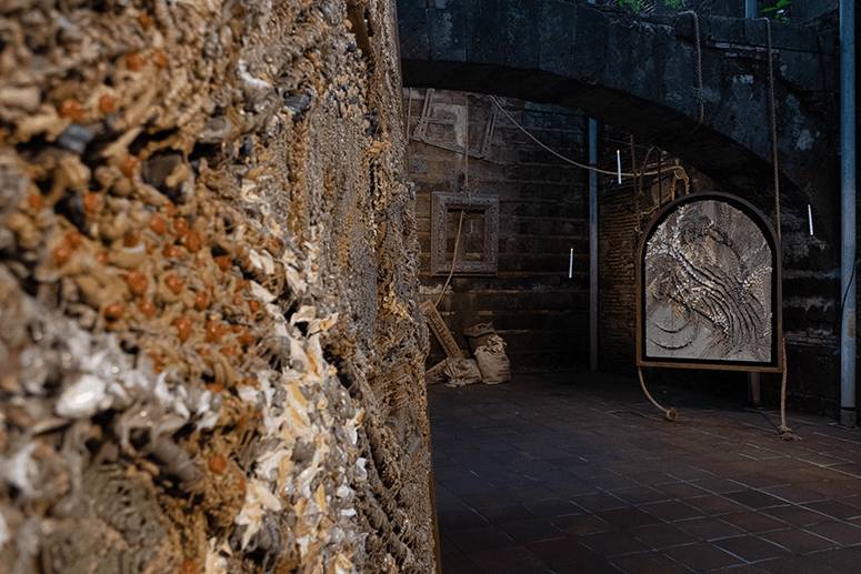“The challenge was how to make powerful works,” the artist told me in a chat over Zoom. “I went to the venue almost every day for five days, internalized what the place had to offer: the echoes, the footprints, the exotic herbal plants. When the walls get wet when it rains, that’s when their colors appear. During my visit, I toured the museums inside (Intramuros). I saw the old garments worn by saints and priests as well as some paintings.”