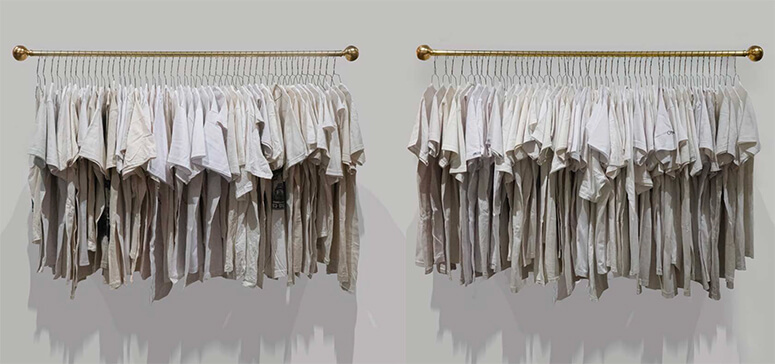 The project started with promotion, he says: an online open call for shirt exchanges. “It involved sourcing through social media—that was essential, if you’re obsessed with the current condition of the shirts.” He was careful to contextualize what the project was all about—“like an advance party to explain it”—noting there was supportive “word of mouth” in the small town. In other contexts, the use of solicited, used garment could seem… a bit exploitative, perhaps?