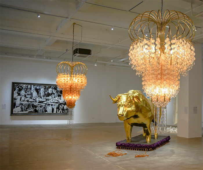 Center stage is a gilded papier-mâché bull. Ginintuang Pangitain (Gilded Phantasm) not only involved the community in crafting a huge toro covered in gold leaf, it adds a looped video nearby documenting the process. “I wanted to bring back that kind of access to creativity to the ordinary people because when you parade the giants, the optics are very colonial and very feudal: you have giants running after the locals and then on the periphery are locals watching the display of power of the rich people in that small town,” he says.