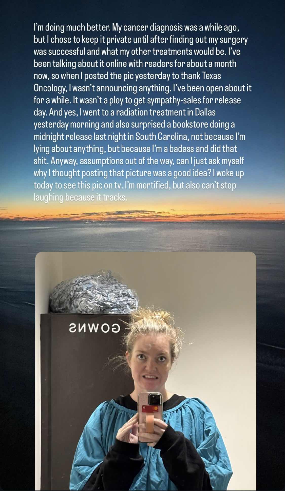 In a now-expired Instagram story posted on Jan. 12, the bestselling author shared that she's almost done with her radiation treatment.