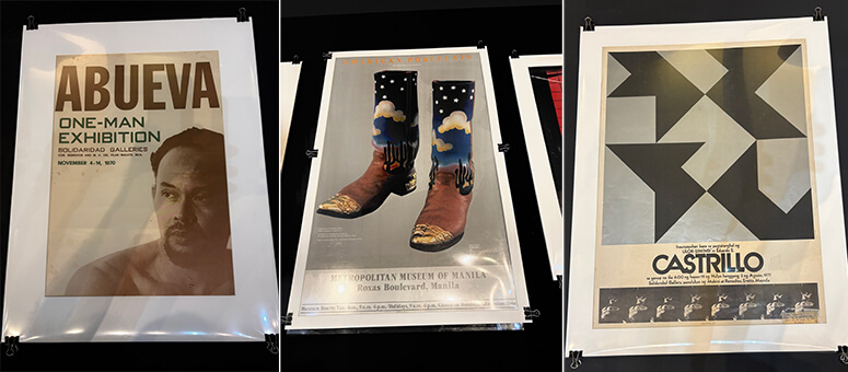 Seen from above, It’s an eye-catching macro view, and you spot Dindin Araneta, current director of the Saint Benilde Center for Campus Exhibitions, as well as Gabbie Lichauco, also a Benilde instructor and the designer of the exhibit’s unique look. Originally, “We were thinking of hanging the posters around the room,” he says, but instead hit on this chronological journey: you thread your way through the art posters set upon slightly angled, multileveled platforms. The multi-leveled tables remind me of Lichauco’s work with Rita Nazareno for this year’s Art Fair at Circuit Makati, which just concluded.