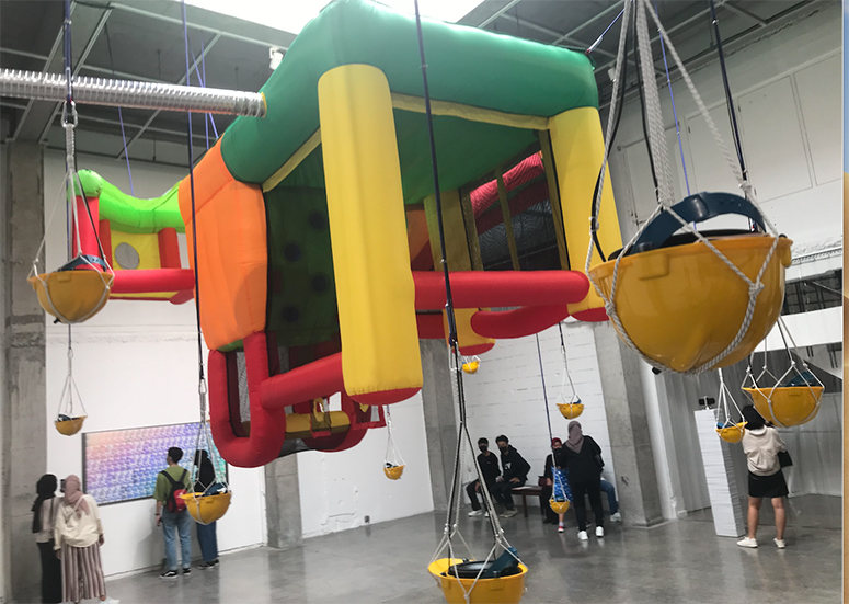 Somewhere behind a wooden cart selling bubur ayam bangudin, a kind of Indonesian chicken porridge, there’s a downstairs gallery backed by Art Jakarta artistic director Enin Supriyanto. Rubanah calls itself an “underground hub,” but its stealth is a strength: gallery directors Diana Wibawa and Grace Samboh summon the public with questions: “Does a mirror call you?” “Why would mundane objects be associated with an ethnicity?” “If one could find a waterfall in the mall next door, why drive hundreds of miles and hike?”