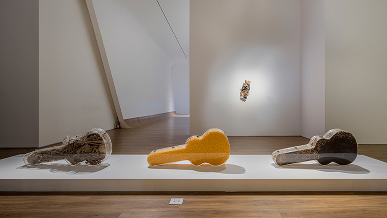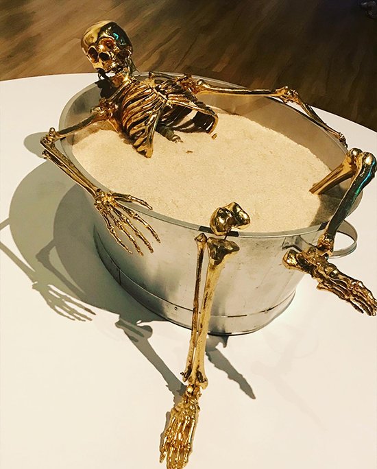 Skulls and skeletons figure prominently in the show, as in the sculpture of two skeletons boning (“Happiness Is a Warm Gun”) which museum guards insisted not be photographed; or the three Lucite guitar cases stuffed to the brim, respectively, with cigarette butts, yellow pills and compacted human bones (“Too Young to Die, Too Old to Rock N’ Roll”). Then there are the paired skulls with Mickey Mouse ears and tiaras (“King and Queen Jeff Koons”) and the skeletized duo of British artists Gilbert and George.