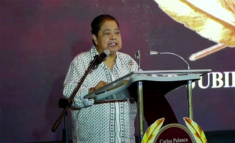 Receiving the Gawad Dangal ng Lahi was Ruth Elynia Mabanglo, one of the perennial first-prize winners who had been elevated to the Palanca Hall of Fame in 1995. Assisting her onstage were Maria Karina Africa Bolasco and Alma Cruz Miclat. Elynia delivered her keynote address in English and Filipino, titled “Bakit Ako Tumutula.”