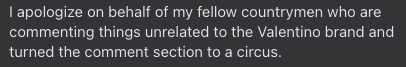 One individual gave context about the flood of Filipino comments, adding "I apologize on behalf of my fellow countrymen who are commenting things unrelated to the Valentino brand and turned the comment sections to a circus."