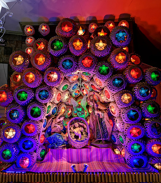 San Lorenzo Ruiz’s belen is made with an assemblage of colorful hen baskets, each with a lit parol inside to symbolize the frontliners. The belen is placed near the church’s main entry as a way to encourage people to go back to the church, especially in these most trying times.
