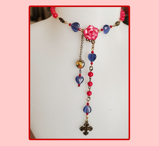 My rosaries are unusual. They have extra beads between decades. One bead is for the “Glory Be.” Then there’s a small divider. The next bead is for the Fatima Prayer and other ejaculations. Then another small divider. The next bead is for the next mystery and the “Our Father.” Also I put a rose on all the rosaries I make. That’s my trademark. I wanted to put rose fragrance, but I can’t find it in the pandemic. You can wear the rosary as a necklace. It looks very pretty.