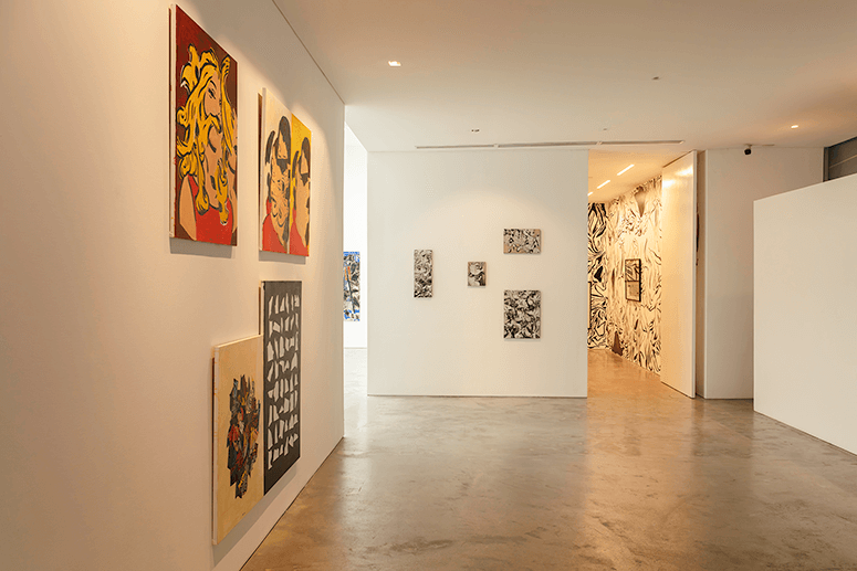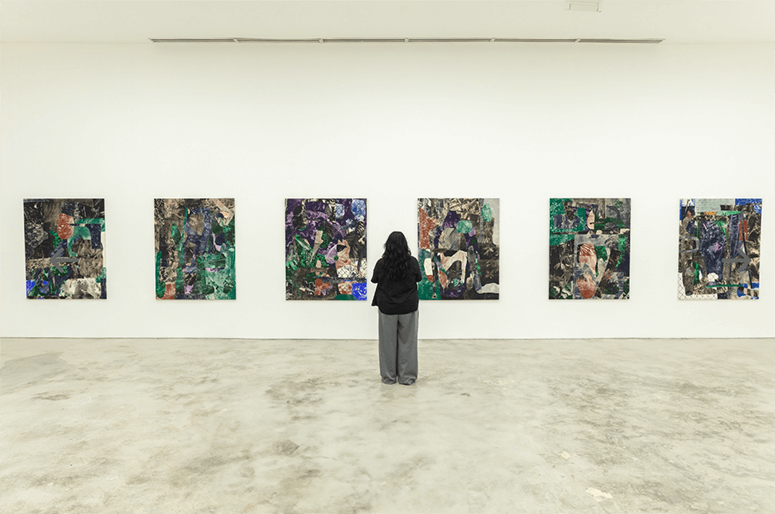 As I made my way through the gallery, I thought of the movement of ripples—the recursive motion that brings difference with each repetition. How each wave brings with it the force of the wave that came before it. Within each artists’ body of work, elements double on themselves, get foregrounded, and eventually templated. A remarkable cohesion takes place in the process: Soler’s “Red Painting” series, assembled with found objects and wood, shares its forager impulses with his son Luis Antonio, whose “Fever Dream” compositions tune into screenprinting and linen to create a staggered sense of sprawl.