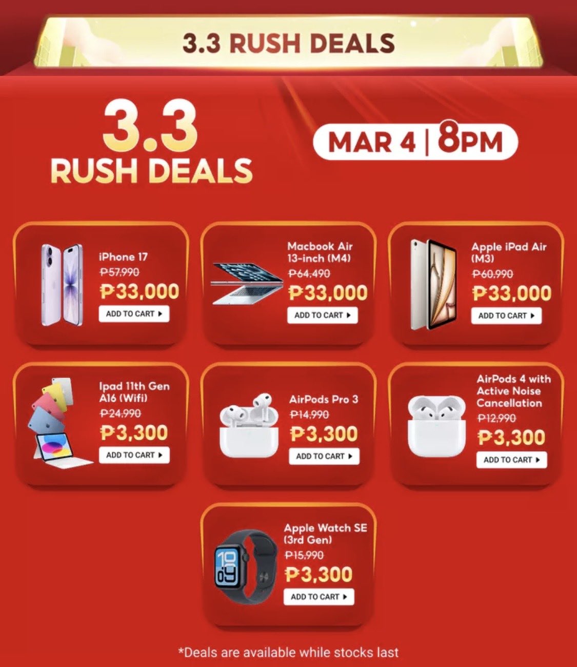 Shopee's offering an extended 3.3 sale on Apple gadgets at 8 p.m. on Wednesday, March 4. Aside from the iPhone 17, you can also score a MacBook Air 13-inch M4 for P33,000 (from P64,490), iPad Air M3 for P33,000 (from P60,990), iPad 11th Gen A16 for P3,300 (from P24,990).