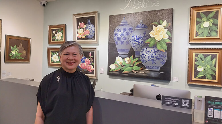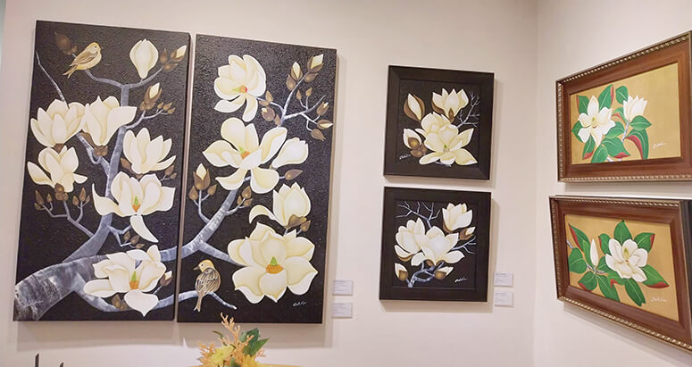 Those paintings are highlighted by the artist’s favorite subject, magnolias, part of Addie’s 21st solo art exhibit titled “The Scent of Magnolias” presented at the Galerie Francesca, SM Megamall. Her dainty, pristine magnolias come alive, more elegant and sensuous against the shimmering jars. The blooms remind her of her mother, cutting fresh flower buds at their Baguio home, recalling Haruki Murakami’s line: “In the pale evening gloom, when the soft fragrance of magnolias hung in the air, my heart would swell without warning.”