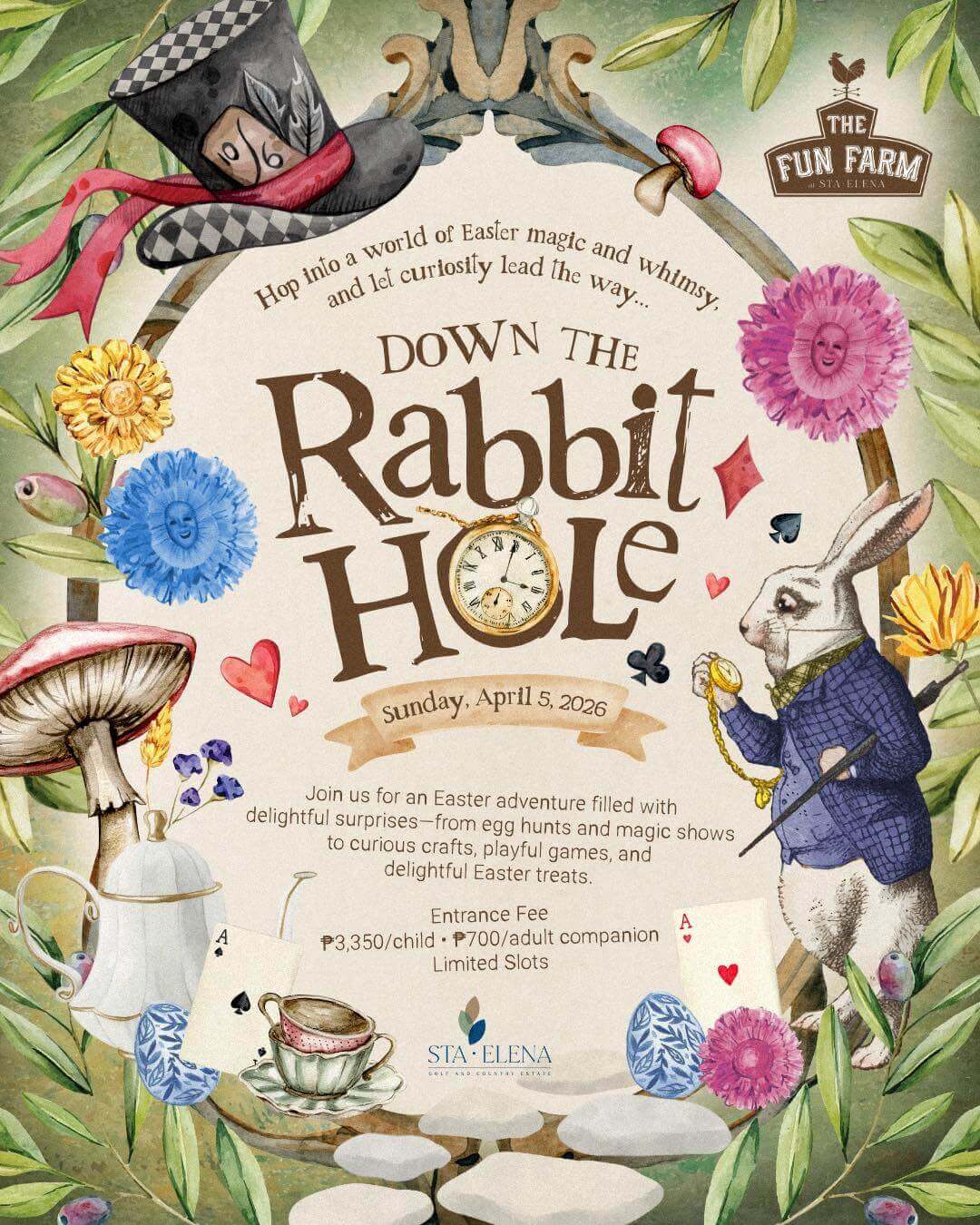 The farm is turning its Nature Trail into a whimsical wonderland on April 5, featuring activities such as an Easter egg hunt, arts and crafts, a Mad Hatter hat making, a fairy garden making, a magic show, whimsical games with prizes, a tea party, and face painting.