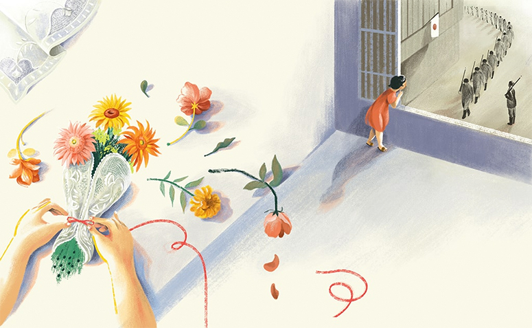 This particular illustration was for a spread talking about how the Japanese invasion cast a dark cloud on the young Araceli’s childhood, forcing them to close a flower shop they operated in Manila. The wilting flowers also represented the darkness that was to come in her life with the invasion of the Japanese.