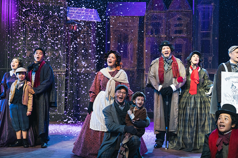 The audience at the Proscenium Theater may see a lot of the country’s political crisis and social discontent in the bleak winter landscape of Charles Dicken’s London of 1854, transposed into a stage backdrop of ominous Victorian houses, but they certainly came to escape all that, children in tow, to revel in a fantasy holiday tale with infectious melodies, soaring orchestral music and spectacular production numbers which A Christmas Carol, presented by Rockwell and 9Works Theatrical, ultimately delivered. But more than high-kicking entertainment, there is a story of redemption and hope that is in tune with the spirit of the season.