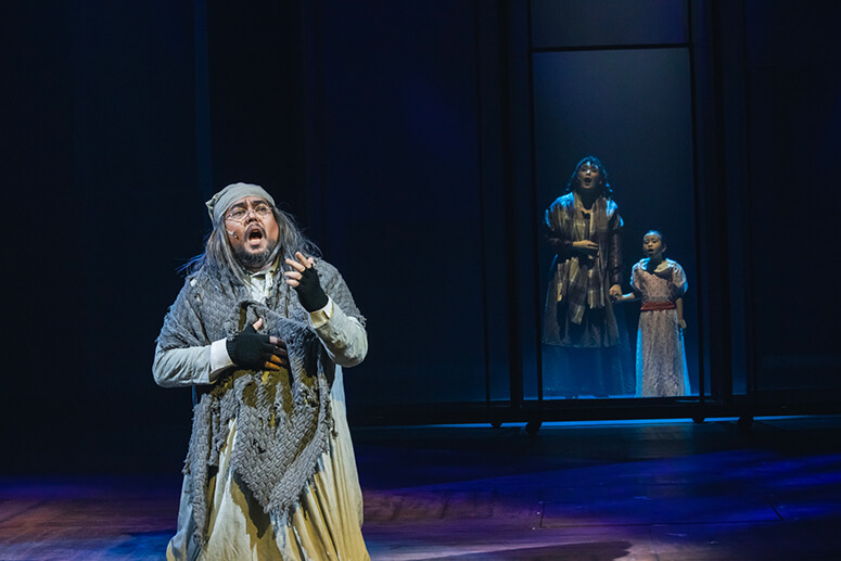 As part of this oneiric concept, sets by Mio Infante had translucent Victorian cityscapes in shades of blue and grey that reflect Scrooge’s gloomy worldview. This was a good neutral base for actors to stand out, with costumes that are more colorful albeit in a muted palette that was not too jarring, with the appropriate styles beginning with Regency’s slim empire silhouettes progressing to Victorian bell-shaped skirts.