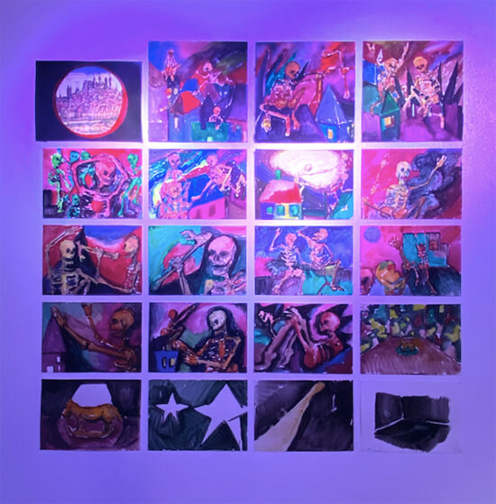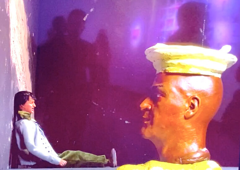 In “Wolves at the Door,” crude animated skeletons and versions of Kasper Hauser converge in a Nuremberg dungeon. “It’s a medieval death dance—a party of death,” says Marty in the “Cosmic Encounters” video. “Kasper is myself.” Kasper prefers the comfort of his cell, but he’s sent to a desert, where he finds a “shaman”—Kidlat—in a cave with a Rizal altar, playing a flute.