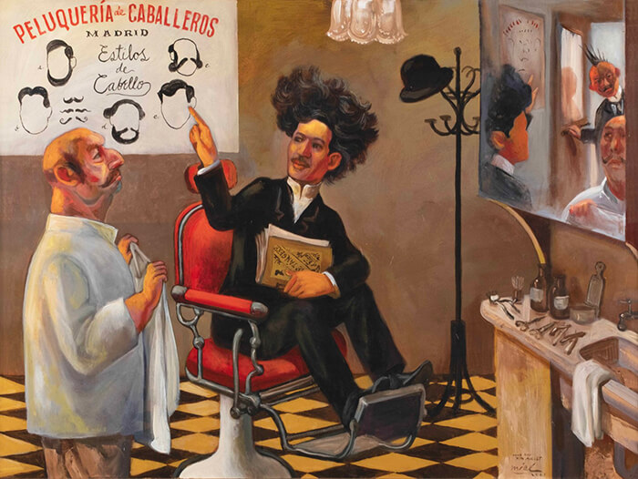 The Leon Gallery auction also threads the old and the new, the 19th-century and the contemporary: one wonderful painting by the sassy, mischievous Dengcoy Miel exudes that main character energy, with Rizal in a Madrid barber shop, wondering which haircut would suit his temperament. He is half-in and half-out of his seat but manages to clutch the original manuscript of the Noli Me Tangere. (Miel, like Rizal, is a Filipino working abroad as a top editorial cartoonist and brings his zany humor to The Straits Times of Singapore.)