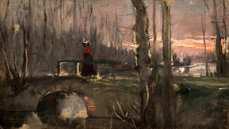 Two other paintings also say something about ilustrado ex-pat pursuits; the first, by Felix Resurreccion Hidalgo, captures a woman in red crossing a stone bridge in the Bois de Boulogne, that Parisian park where the Duke and Duchess of Windsor would retire and where the Fondation Louis Vuitton museum rules today. The Bois has long been an escape and pleasure spot for French royalty and a beautiful retreat for the Manila expat crowd, who would often picnic among the trees. It’s an ethereal work, one of Hidalgo’s rare land-based paintings, of the Bois in the pale light of a winter sunrise, amid trees that have just lost their leaves.