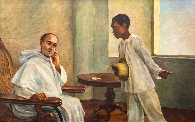 The O’Farrell work is a copy of a Juan Luna—the original now lost in the sands of time and war—depicting the very moment the Katipunan is betrayed by blabbermouth Teodoro Patiño to the Tondo parish priest, Mariano Gil. (No doubt Luna was painting from memory—he had been clapped into prison, and his accuser was probably none other than the noxious Padre Gil. (A second work based on Luna’s “Ecce Homo” from the same period is also in the sale. ) It’s a vivid reminder of the consequences that Luna and Jose Rizal would face for their actions, real or suspected, in the extreme.