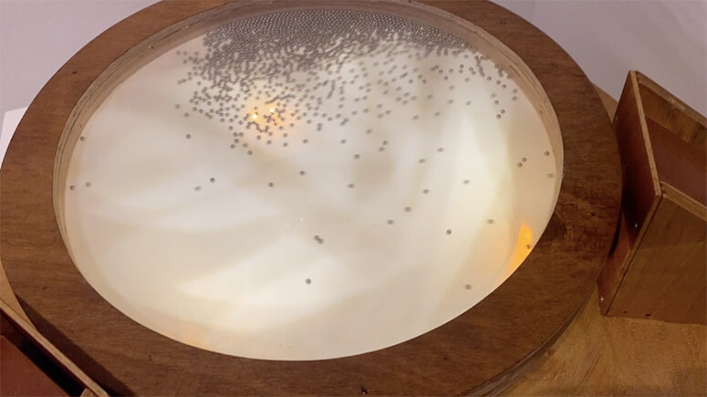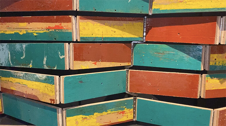 That’s built into Marco Ortiga’s latest exhibit, “Baroto,” now at the Chino Roces art space until Dec. 3, in which Ortiga has fashioned an elaborate field of “kinetic art,” this time incorporating boards from worn-out pump boats into an arresting scene: you watch the slabs of wood, decorated with their original fading paint, rotating in their own asymmetric, non-synchronous patterns around the ground floor viewing space. Another piece features a slowly undulating round plastic container full of ball bearings; their rolling movement back and forth suggests the distant crash of waves, if you have the right kind of ears.
