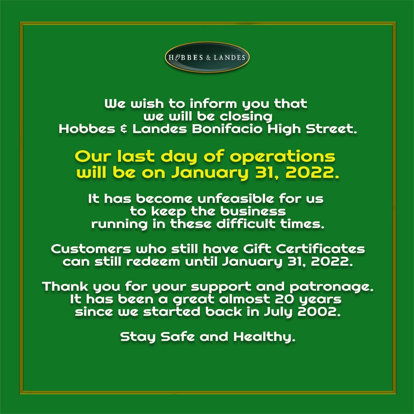 In a Facebook post, Tuesday (Jan. 4) Hobbes & Landes announced that its main store located at Bonifacio High Street in Fort Bonifacio Global City (BGC) will cease operations on Jan. 31, 2022.