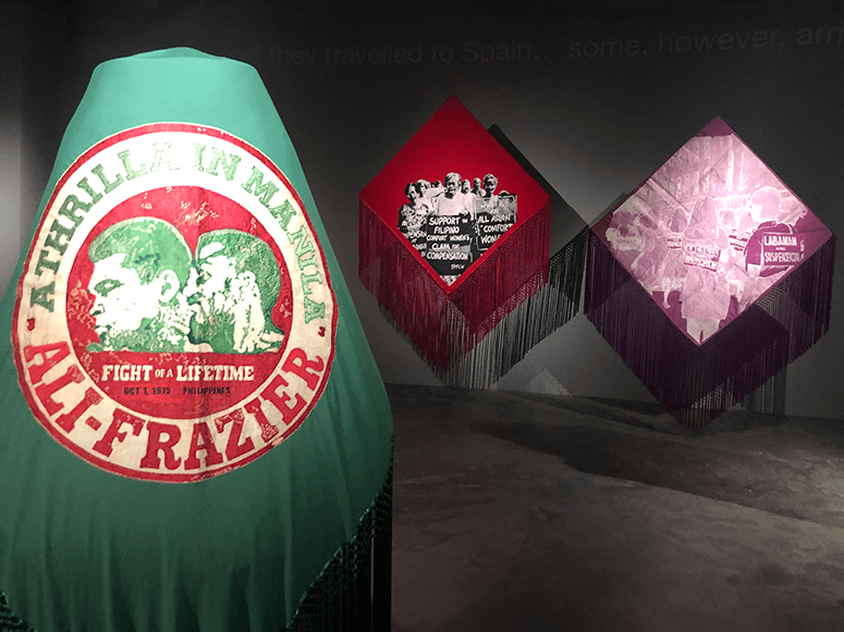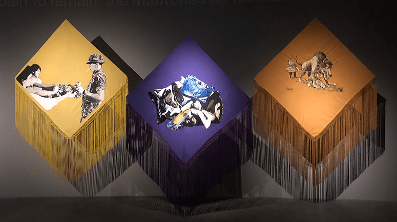 For the final “black” room, Muntadas looks at the way the manton de Manila was first imported from China, passing through Filipino culture, only to become “appropriated” by Spanish society and festivals, mainly in flamenco dance rituals. This part of the exhibit attempts to “cut the connection” from Spanish trade and repurpose the manton through vivid, often provocative images drawn from Filipino political and cultural history, hand-embroidered by Lumban, Laguna artisans, with fringes sewn and outsourced from India. (He describes the embroidered imagery as “a kind of acupuncture.”)