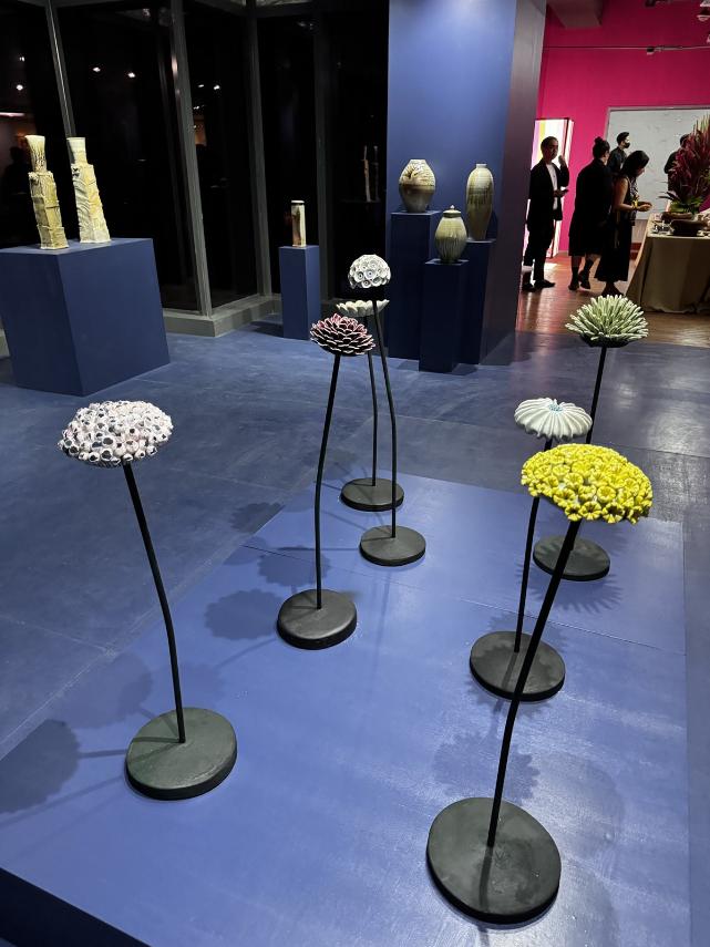 Moving on, our attention was immediately drawn to the elegant ceramic sculptures of husband-and-wife artists Tessy & Jon Pettyjohn. Their “Intersect” collection of whimsical columns featured flowing shapes and vibrant colors that belied their rigid structures. The Pettyjohns greeted our group, revealing that their process of collaboration was about complementing each other’s respective artistic styles, rather than one overlapping the other.