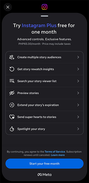 According to screenshots shared by testers online, Instagram Plus costs P65 a month and includes exclusive features to help you control your Instagram Stories.