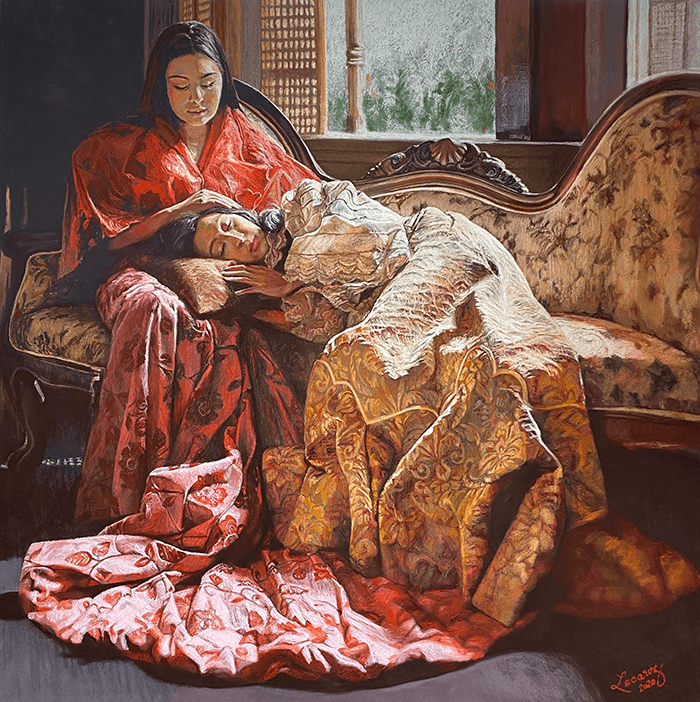 Lecaroz’ latest solo exhibit was Redux: A Homage to Maestro Fernando Amorsolo, at Galerie Anna in SM Megamall last May. It was one she had always dreamt of painting in spontaneous realism style. She proposed the concept to Nandy Lazo, the son of Sylvia Amorsolo Lazo. He replied that it was perfect timing, as they had also thought of looking for an artist who could depict his lolo’s body of work into something contemporary.