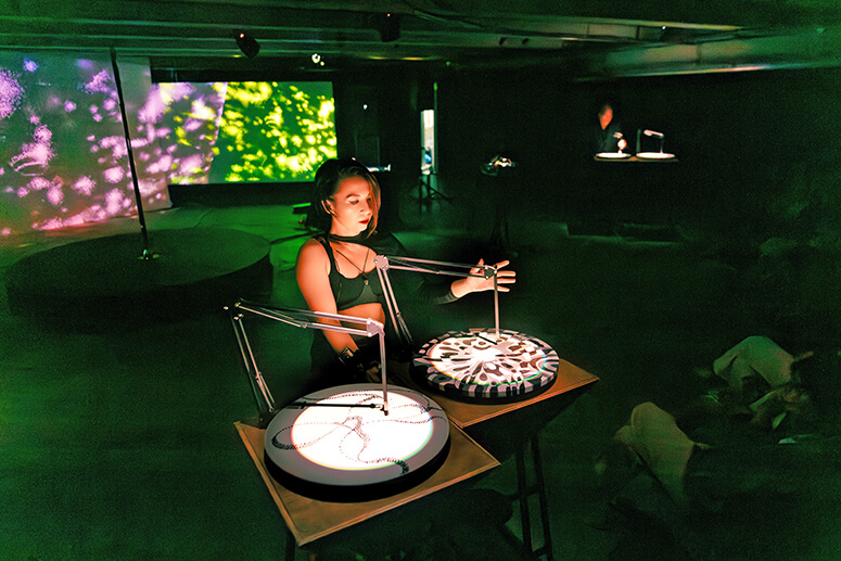 TAD ERMITAÑO: We’re basically the art equivalent of a band. We perform music exactly like a band does, but we make art and build our own instruments, all collaboratively. We also have totally different specialties: CD dances and draws; Marco builds kinetic sculptures; and I do noise, electronics and programming. One of the things we naturally do is explore and use new technologies in art—sensors, microcontrollers, wireless networking, and so on.