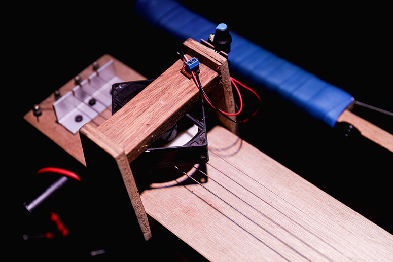 Inspired by the 17th-century aeolian harp, the electric Hinanginmerges it with an electric lap steel guitar, adding a whammy bar, replacing wind with magnets spun by a small motor—a low-tech e-bow generating magnetic turbulence.
