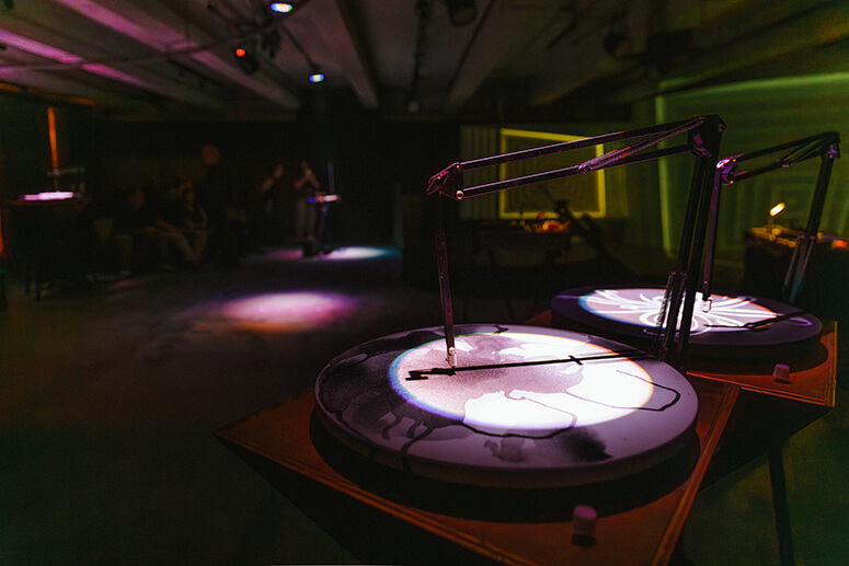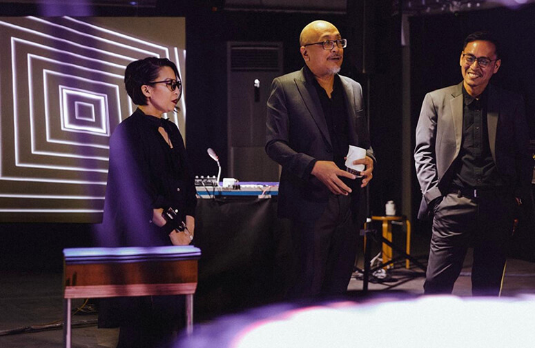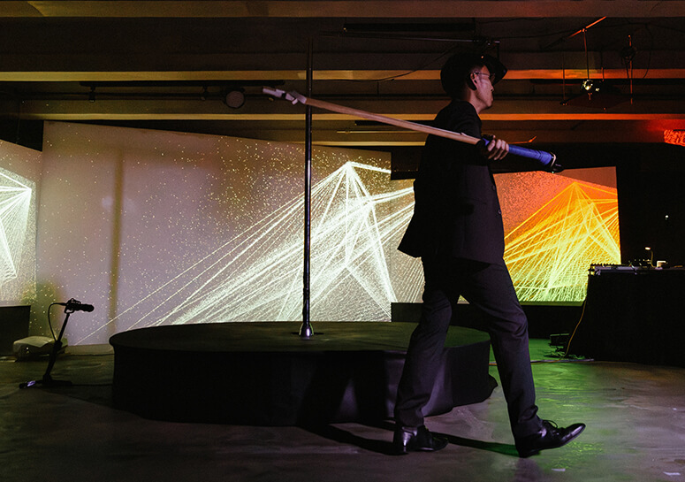 There are bits of Somatosonic’s music where it feels like a weather disturbance spewing forth: with staves that boom like collapsing mountains, a pole dance stage that jars like a crack of doom, and sensors that conjure electronic scatting and symphonic static. The multi-disciplinary art unit—composed of Tad Ermitaño, Christina Dy (CD) and Marco Ortiga—recently had a gig at WHYNot in Karrivin Plaza, where the trio engaged in an artistic dialogue with new media artist Miggy Inumerable. Their performance wove together technology, sound, pole dance, audio-kinetic sculptures, live visuals, and a darkly brewing storm of sounds.
