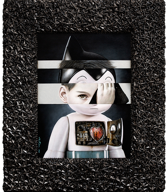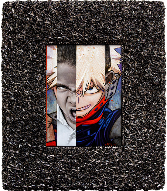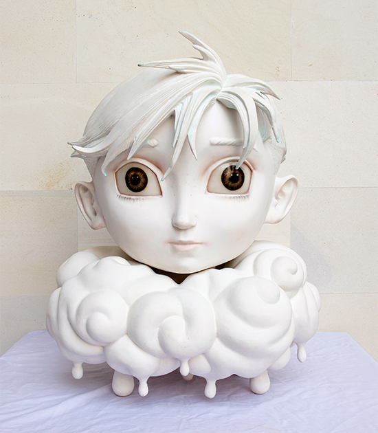If “Comic Lives” bandied about astronauts and Donald Duck, the latest paintings and sculptures are more Japanese pop culture-centric: kawaii eyes, drill hair, Astroboy, Naruto, anime, melted bears in pop colors, etc. Cuteness overload with a hint of something unnerving: the emojis are not merely “superimposed,” they are part of the reality being depicted, like flattened layers of what is objectively present.