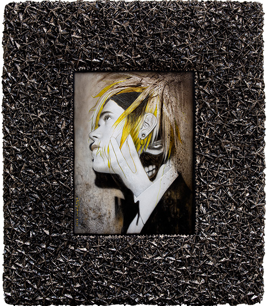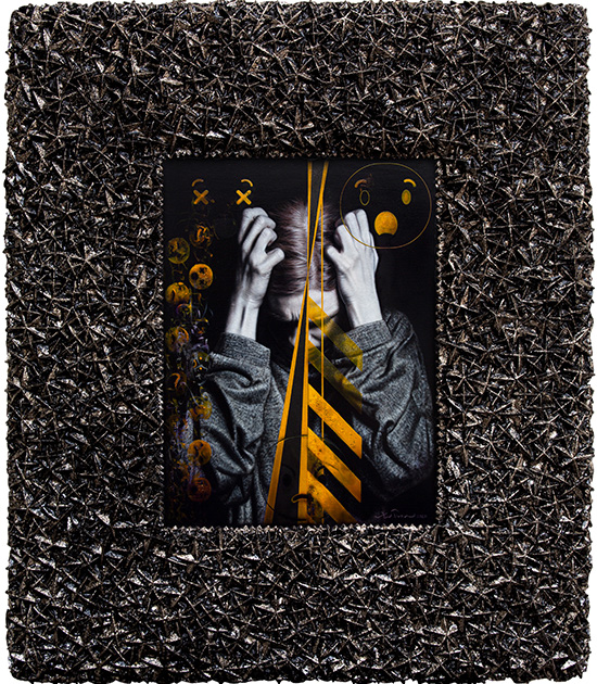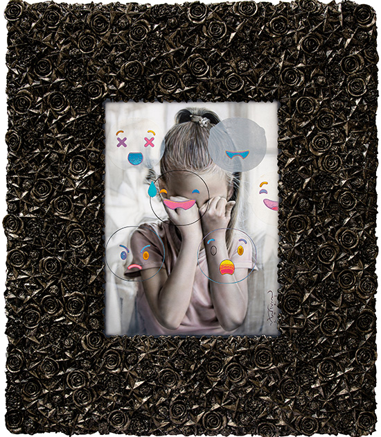 Ventura’s three different hyper-realistic portraits of girls are intervened upon by anime eyes and a procession of emojis.