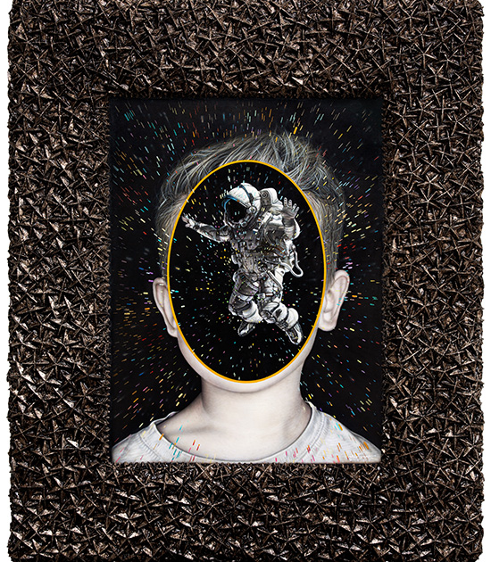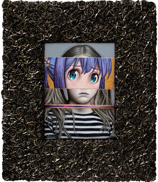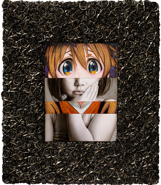 In his previous show at Whitestone Ginza New Gallery titled “Comic Lives,” he presented paintings with gulfs of stacked realities. In some of the paintings, anime eyes and hair are — “superimposed” is not the word we are looking for here, but rather — collaged or overlaid on hyperrealistically drawn images of women, statues or even (as meta as it sounds) “paintings.”