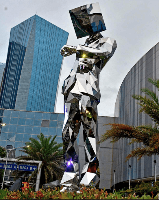 Fil-Am artist Jefre Manuel-Figueras, who’s made a large footprint for himself in public art, thinks it’s meant to be much more. “They’re icons. They become the postcard of that location,” whether it’s Paris, New York City, London or Manila. A public art piece can center and define a location. After designing public art for Robinsons Land Corp. in Naga, San Pedro, Laguna, SM Megamall’s Time Sculpture (the box-headed man), and now a 60-meter-high stainless-steel figure known as The Victor bestriding RLC’s Bridgetowne township, Jefre has sought to put the Philippines on the map of iconic locations. Toward that end, right from the start, his colossal man had to be taller than… the Statue of Liberty.