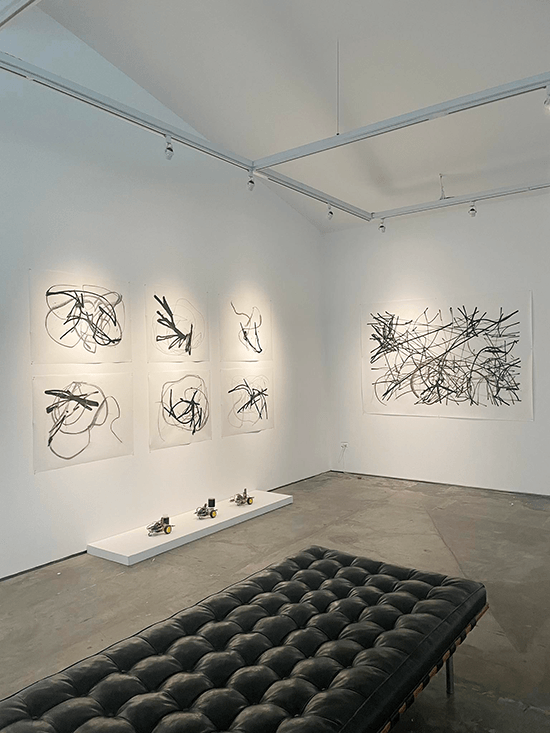 In “Polaroids,” a computer program by Ermitaño tracks Dy’s movement in space. The prints present the final patterns, while videos showcase the lines emerging in real time.