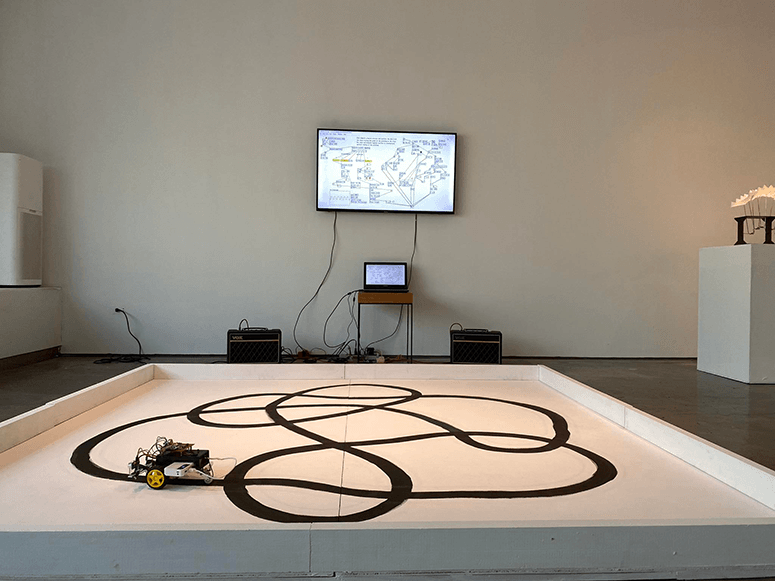 “Rogue Reader” sonifies graphics via acts of unauthorized reading: the robot skates over Dy’s painting, transmitting data from its mechanical eyes to a program by Ermitaño running on a remote computer. The program then transforms the data into sound.