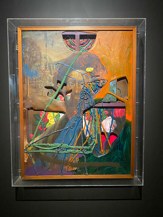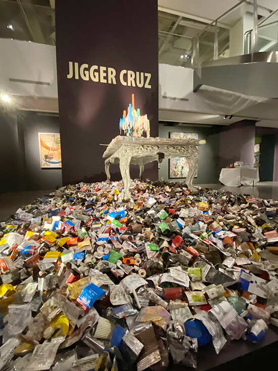 Several of his works pay tribute to his love of oils. At the show’s entrance, there’s a mountain of used-up tubes (Crisologo jokes “There’s been a lot of complaints from the other Filipino artists, because there’s no more stocks of oil paint”), atop of which sits an old wooden table coated in thick layers of dried paint, which he says is literally his “palette.” At the center of this table stands a melting psychedelic candelabra, straight from his studio. He says he included all this to make his friends who visit the show feel “at home.” Even his self-portraits are made up of spent tubes, rolled up and empty, and caps, and rubber gloves. Seeing the mountain of tubes is “orgasmic,” Cruz jokes.