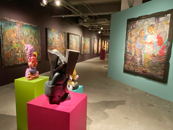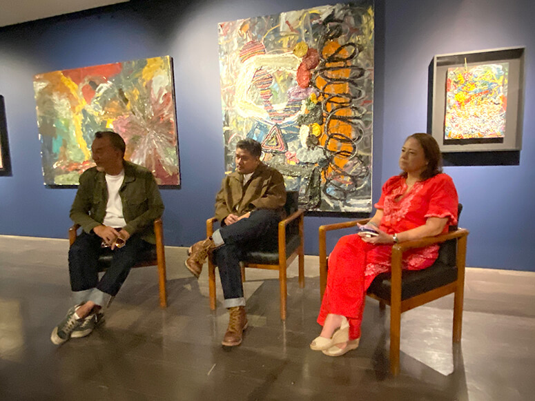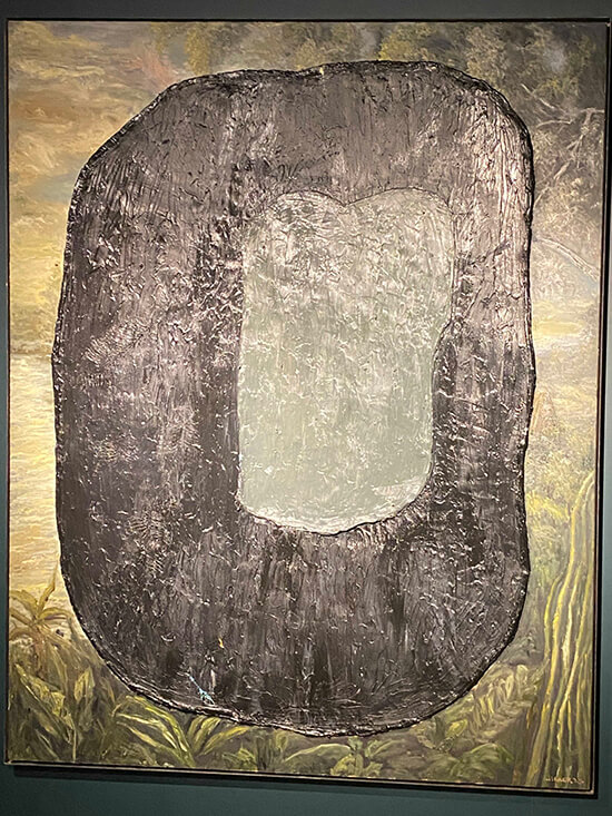 As we walk through the Met, we’re surrounded by waves of sound alternating between soothing, enveloping, and churning cacophony. Cruz’s music, created on analog gear, with sound installations assisted by Erwin Romulo, is a complementary statement to the show, which spreads through six rooms and includes over 100 works—nearly all of them borrowed back from private collectors—that are maddeningly untitled, following no chronological order. “There’s just a little bit more religious imagery on one side of the exhibit,” allows Cristologo—referring to one room you enter through a metallic arch, as though inside a church, where the surrounding abstract canvases represent “the Stations of the Cross,” but in no particular order. “Actually, you see religious imagery in a lot of it. But there’s no theme; it’s a mixture of new works, old works, and sculptures. So each work, for me, directly relates to the one beside it, and the one next to it.”
