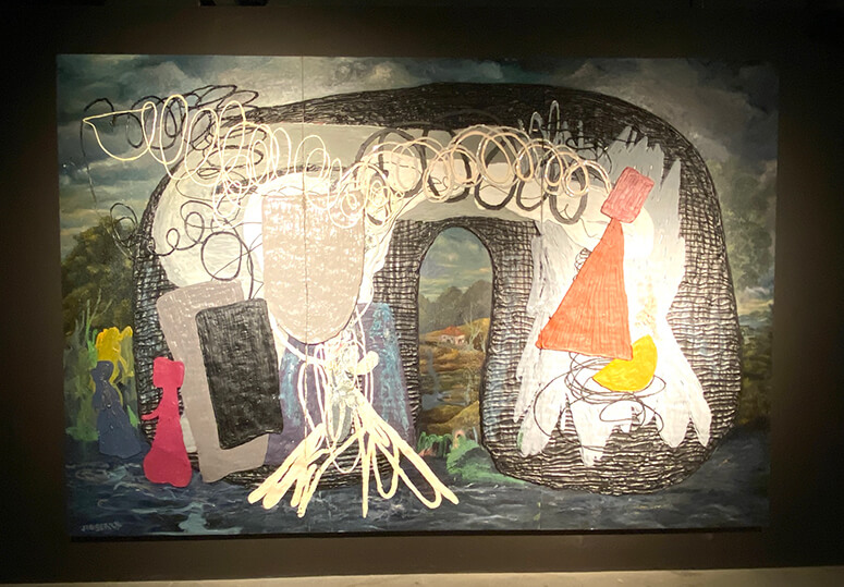 Cruz is visibly pleased by the abstract soundscapes accompanying his own massive canvases. “I have a different experience each time I look at a painting,” he says. One recent, purely abstract mélange of swirling oils catches his eye: “I think it’s a sexy painting; you cannot rest your eyes.” Another features a black, asymmetric oval he calls a “portal” laid over what seems like an idyllic mix of seascape and forest in soft green tones, a faded background atop of which the portal beckons. This will evoke different emotions for Cruz whenever he looks at it. Perhaps he’s thinking about the process of painting that got him there. “I love being lost and staying lost in painting.”