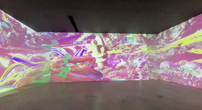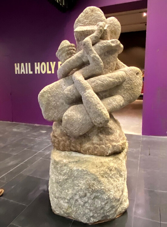 Downstairs, a final room of Jigger’s work is fronted by a large limestone sculpture he calls the exhibit’s “deity.” He repurposed it from two pieces of discarded material from a Cordilleras quarry, rendering it as a model with a 3D printer, then completing it large scale. His sculptures also pay passing tribute to older traditions, just before quietly demolishing them.
