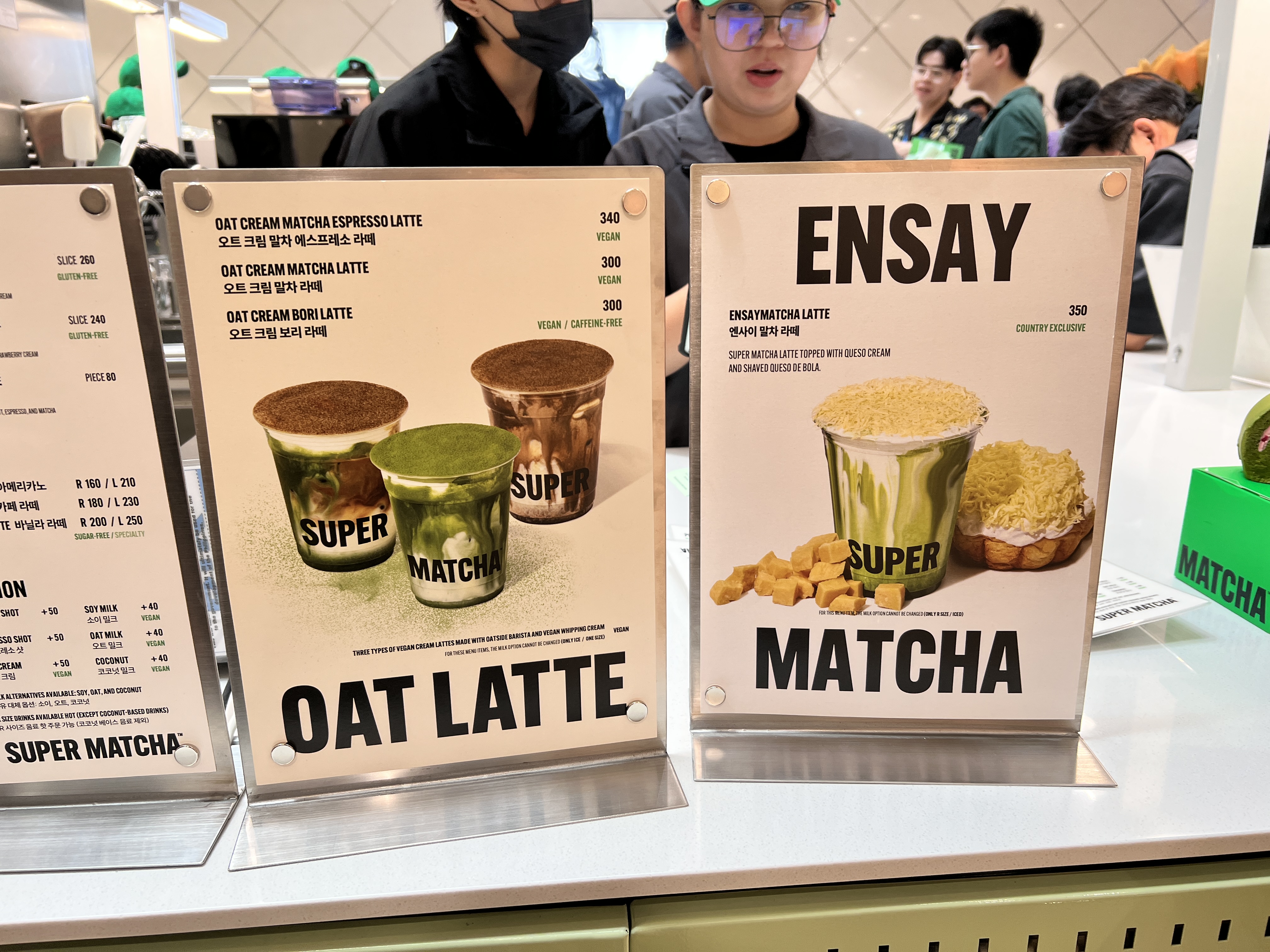 The menu revolves around matcha in different forms. The Super Matcha Latte offers a smooth, earthy sip, while the Oat Cream Bori Latte brings a nutty and creamy twist.