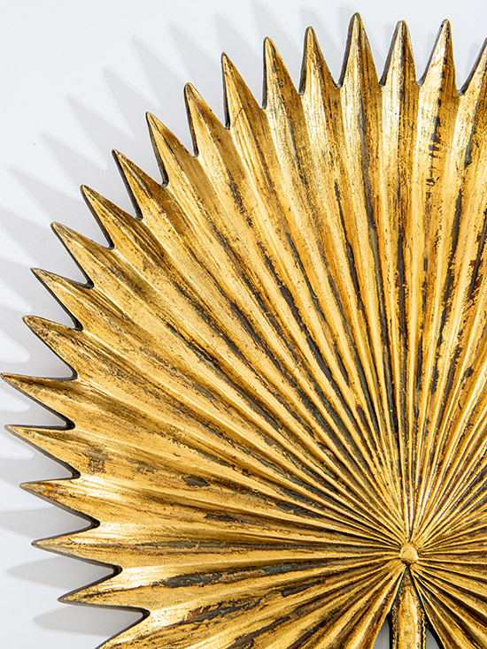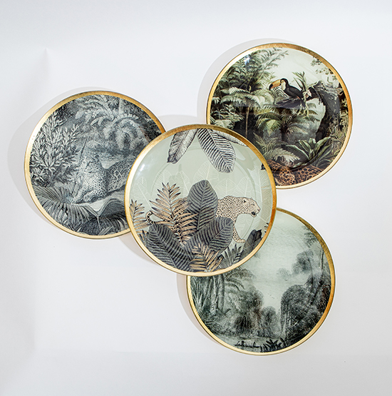 There are foliage-shaped wall decors in metal and golden resin, ceramic planters/vases fashioned intricately to resemble the stem of a bamboo, pillow cases rendered in textured leafy patterns, and glass decoupage trays with animal prints, which can be used for storage or simply as decor.