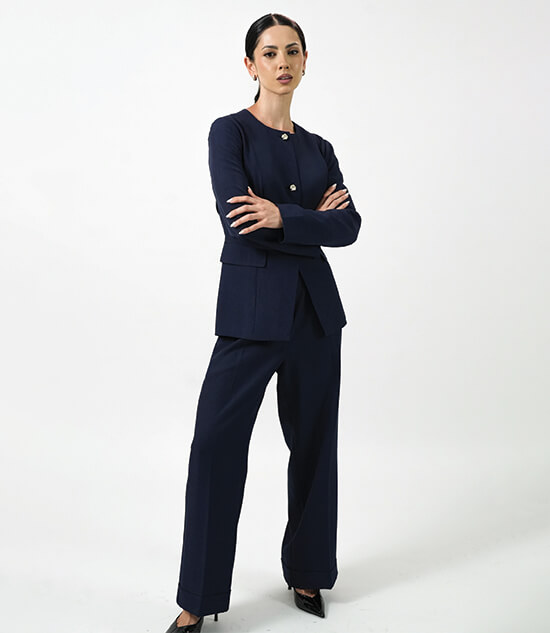 Next, she called a model wearing a navy co-ord set. “Who doesn’t love buying a co-ord? I wear co-ords all the time. This one is really beautiful, and it has this silver detailing. As a set it’s really beautiful for dinner, for an event, for the evening, but then if you break it apart you can wear the jacket over a white tee... It’s that kind of versatility that will make it one of those valuable pieces in your wardrobe.”