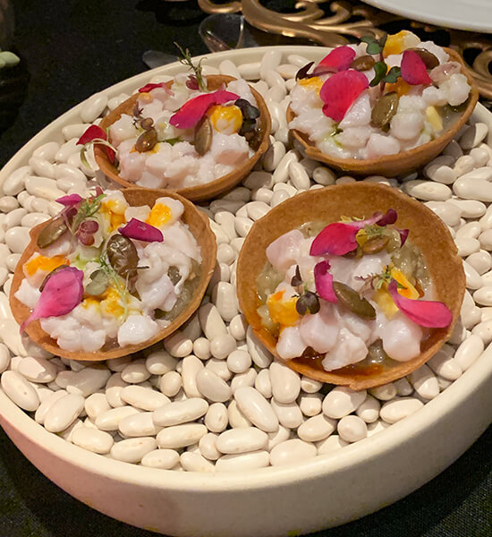 The meal started with barquillos, rolled cylinders of wafers usually eaten as a snack. Into its hollow, the chefs had piped in chunks of Ilonggo-style adobo, giving it more substance and umami flavor. Then there was the kinilaw, made from gingaw, a red snapper that thrives in the lush mangroves of Iloilo. Cured with native vinegar and infused with coconut milk, it was layered with roasted eggplants, chopped green mangoes from nearby Guimaras Island, roasted watermelon seeds, all seasoned with artisanal tultul salt. Served in tartlets on a bed of beans, and adorned with pink petals, it was a complexity of flavors presented with sophistication.