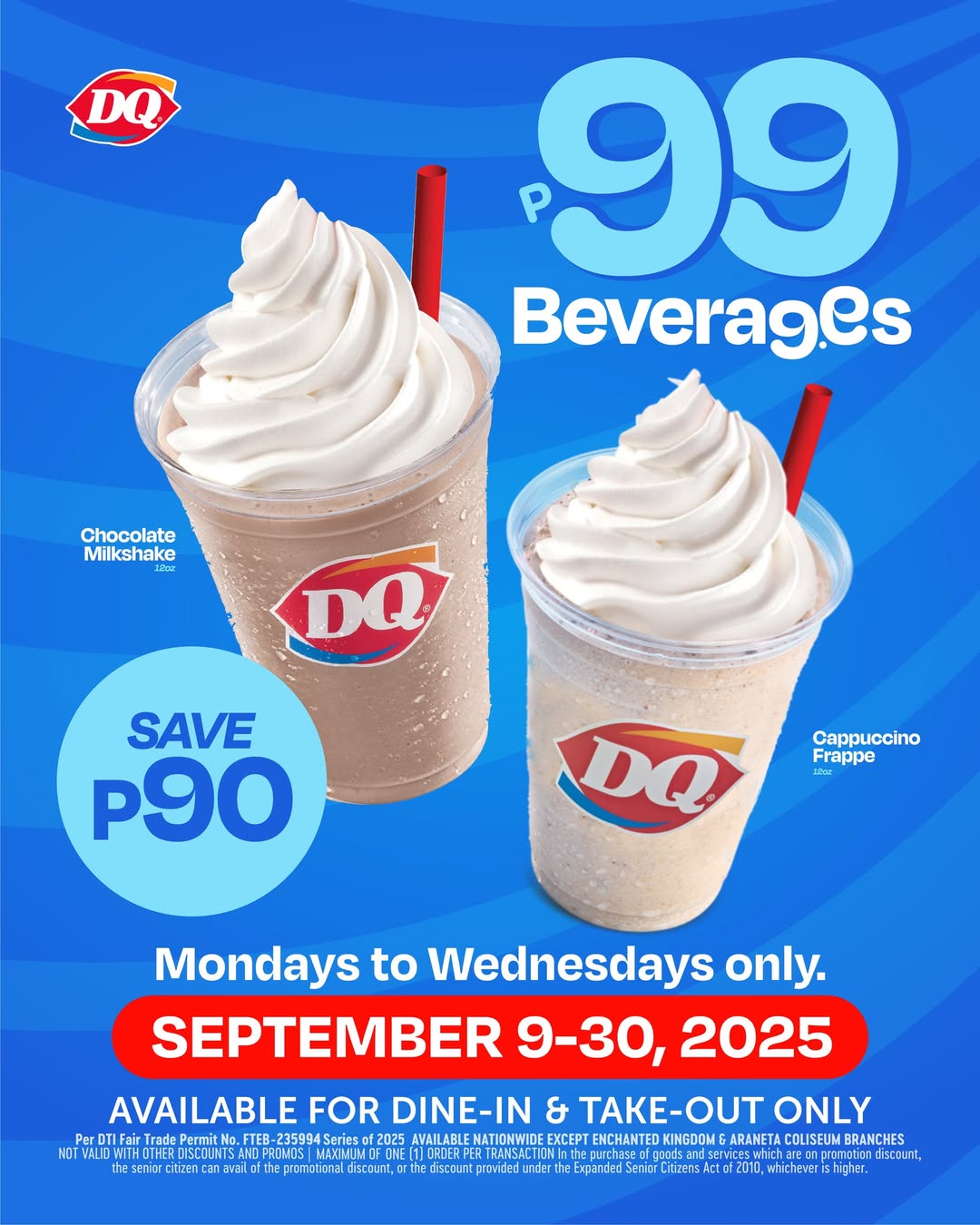Here's a sweet treat for milkshake lovers: Starting Sept. 9, Dairy Queen is offering its 12oz Cappuccino Frappe and 12oz Chocolate Milkshake for only P99 each, letting you save as much as P90. The deal is available from Mondays to Wednesdays until Sept. 30, so you have a lot of time to indulge in this offer. Note that it's only valid for dine-in and takeout transactions.
