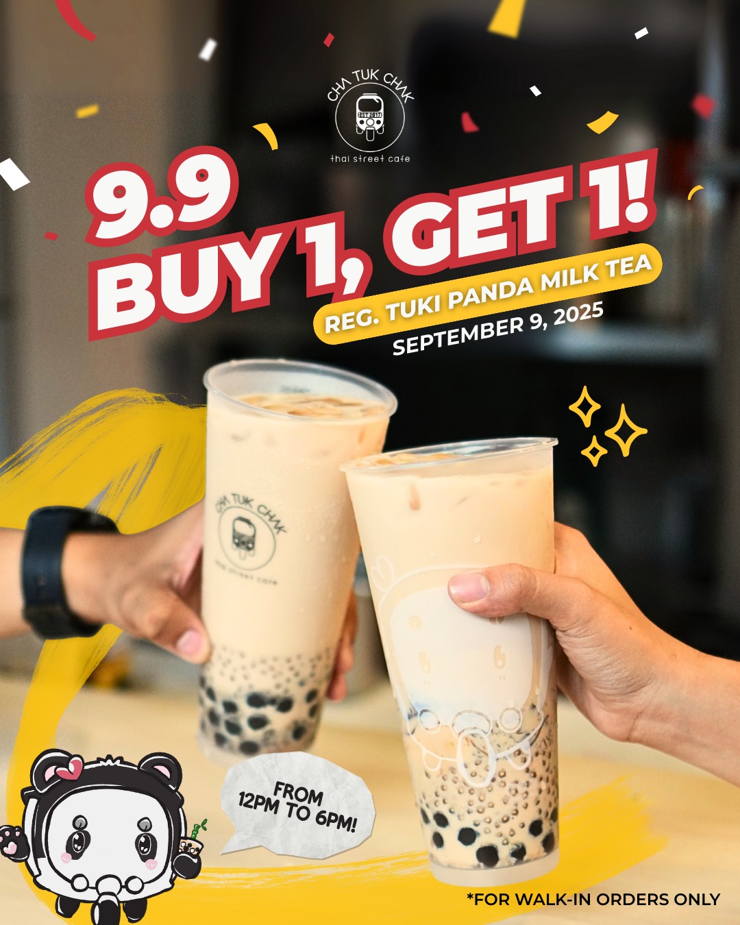 Love milk tea? You can enjoy a Buy 1, Get 1 promo on Cha Tuk Chak's Tuki Panda Milk Tea (any size) on Sept. 9, from 12:00 p.m. to 6:00 p.m. Each person can get a maximum of two purchases with two free drinks per transaction, though both drinks must have the same sugar level. The deal is valid for walk-in orders in all its branches nationwide except CTC Malinta Valenzuela, CTC Quirino Highway, and CTC Batangas.