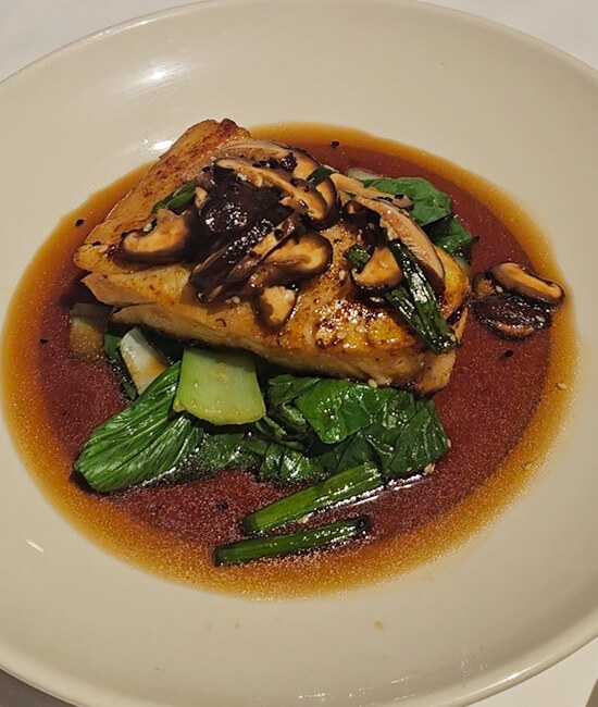 Somewhere between courses, I realized that no one in the room was rushing. This is unusual at lunch. The Miso Marinated Seabass arrived, treated carefully, its surface glossy, the fish tender beneath. The miso was present but disciplined. A Pouilly-Fumé from Domaine du Bouchot brought a grassy clarity that worked with the lighter fats of the dish. The pairing made sense.